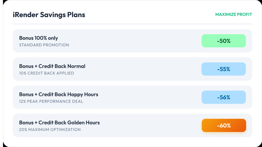 The savings don’t stop after your first deposit. Committed to rewarding long-term users, iRender has integrated a seamless Credit Back program into its system, ensuring continuous value for every project.