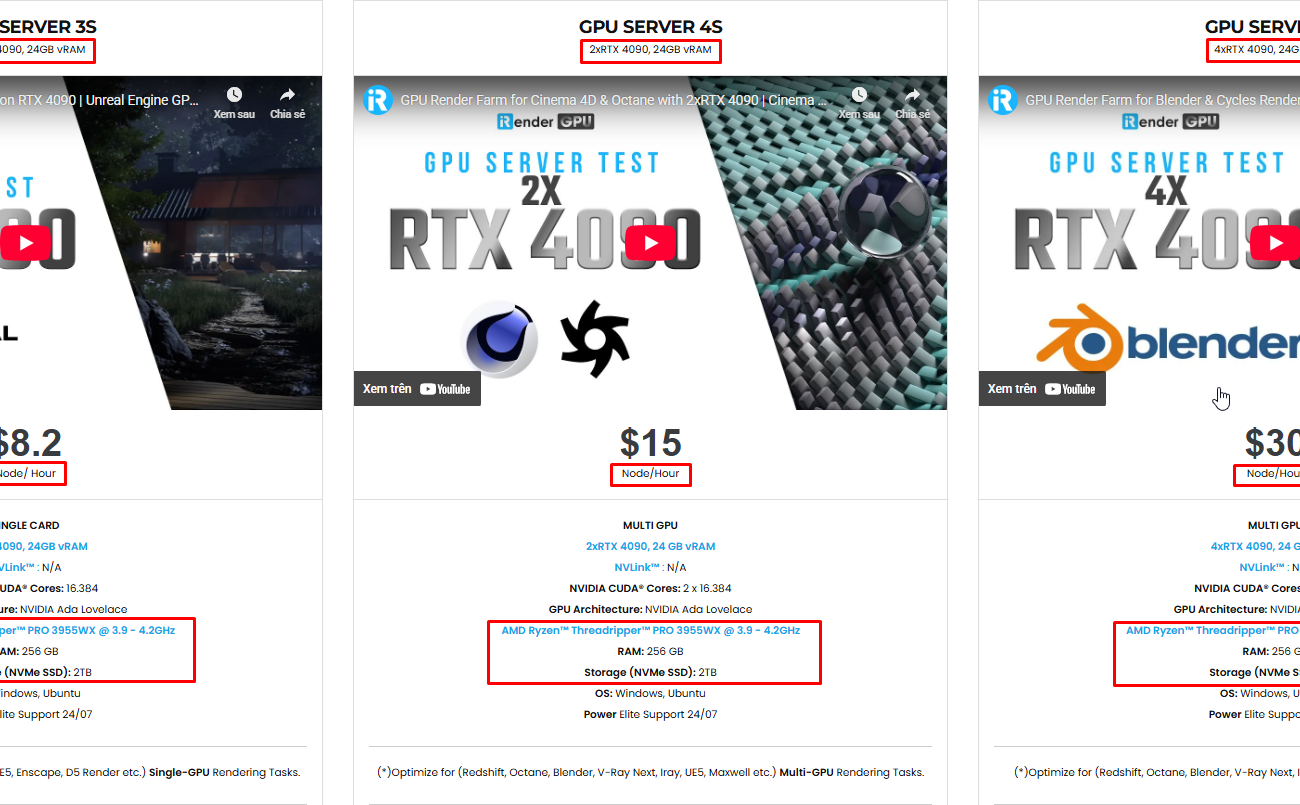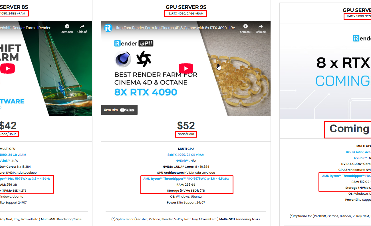 When it comes to pricing, iRender offers a wide range of rental packages at various costs. Currently, iRender focuses more on GPU Rendering, but they still have strong CPUs: AMD Ryzen™ Threadripper™ PRO 3955WX (3.9-4.2GHz) and AMD Ryzen™ Threadripper™ PRO 5975WX (3.6-4.5GHz). You can choose from powerful setups ranging from 1/2/4/6/8× RTX 4090, and they’re even preparing to launch 8× RTX 5090 servers soon, which will be perfect for extremely demanding projects. The prices and machine specs are shown in the following photos.